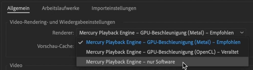 Auf meinem Mac-Book Pro 2019 hat man die Wahl zwischen „Metal“ und „OpenCL“. Apple empfiehlt „Metal“. Das funktioniert auch zumeist sehr gut. Allerdings gibt es Plug-Ins die Metal nicht unterstützen. Zum Beispiel Magic Bullet Looks.